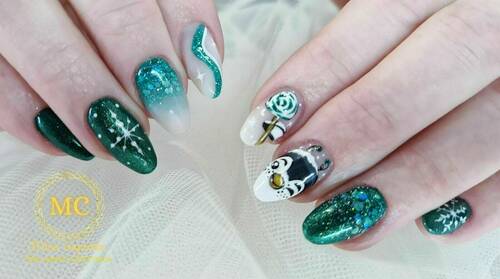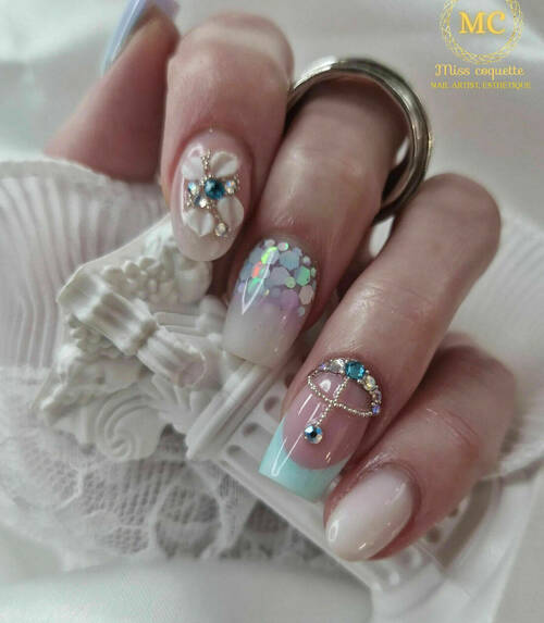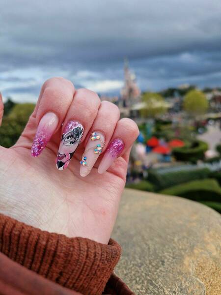 Pose complète au chablons, popits, capsules. Toutes les décorations sont à ajouter en plus dans les options ongleries